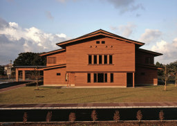 鶴岡市立藤沢周平記念館 本作品は、時代小説家として著名な藤沢周平氏の作品資料と作品世界を後世に伝えるために建てられた記念館です。かつて鶴ヶ岡城が存在した鶴岡公園内という、場として大変意義深く、また様々な制約が課せられる敷地に対して、建物の形態、仕上げなどにおいてきめ細かく対応し、調和が図られています。 展示室・収蔵庫を「蔵」とし、それを覆う「鞘堂」に全体の機能を収める構成は、雪国の伝統的な形式を、現代の環境性、防火性から再考し、取り入れられたとのことですが、地域・風土を真摯に読み解いた成果と言えます。内部に歩を進めるとそれぞれの廊下正面の開口から、大宝館や土塁といった歴史遺構が望めますが、距離が近すぎて必ずしも意図したシークエンスが実現できなかった点は残念に思います。内装等には、地域の生産者と協力し、地場のスギ材を積極的に活用しており、特に収蔵庫の内装全面に無垢のスギを活用して調湿機能を図っている点は、自然素材の活用として特徴的と言えます。建築として、斬新さ、独創性に欠けるようにも思われますが、場に調和を図り、藤沢氏及び親族の思いに誠実に応え、丁寧に造られた作品として評価に値すると思います。 |
